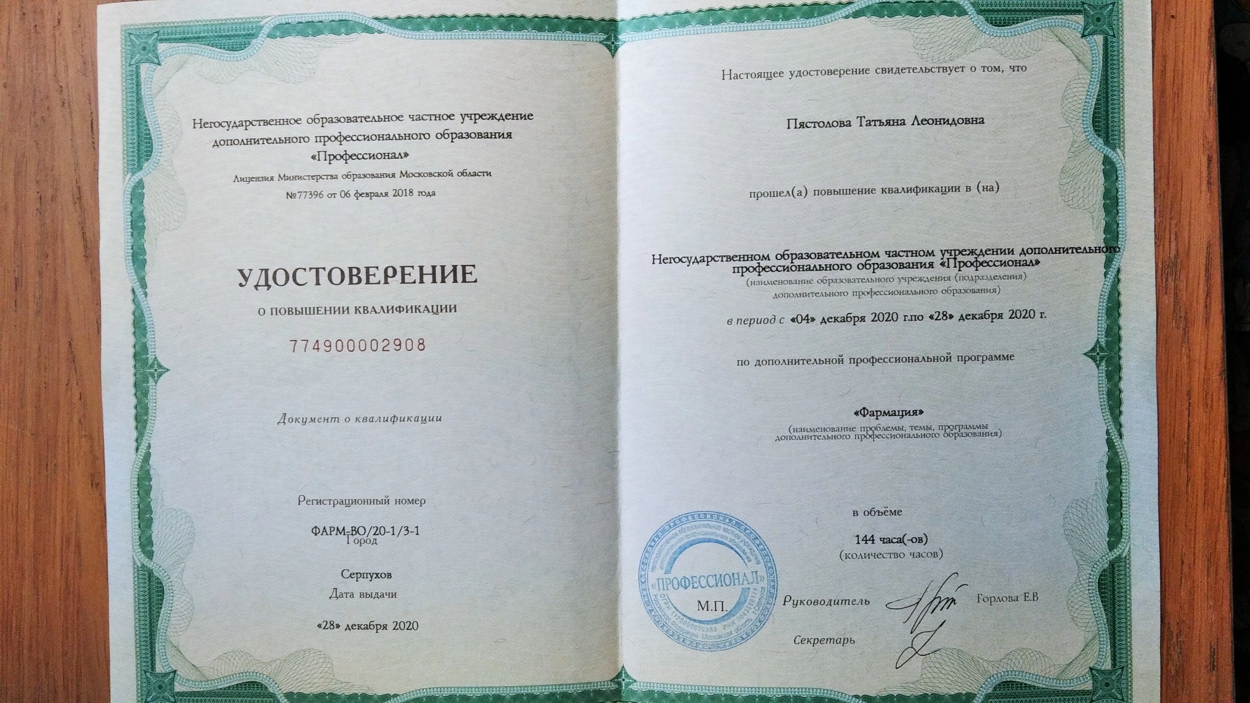 Удостоверение о повышении квалификации по дополнительной профессиональной программе "Фармация".